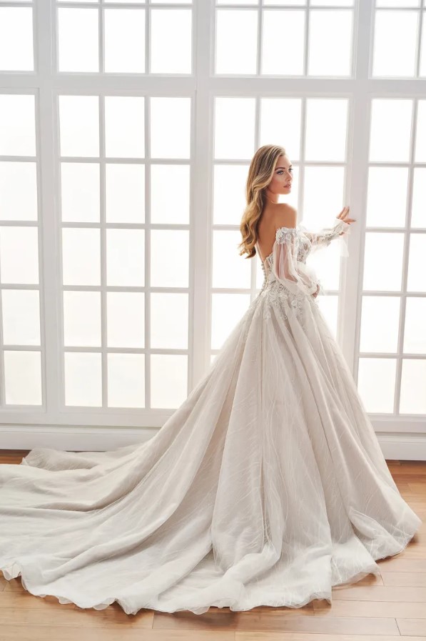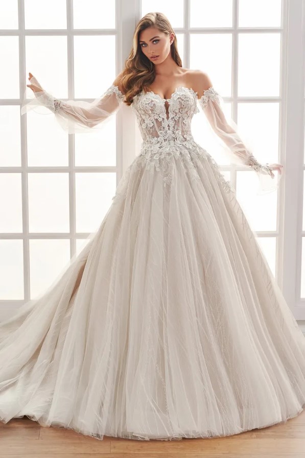 This A-line flattering strapless sweetheart neckline with lace appliqués and delicate beading.