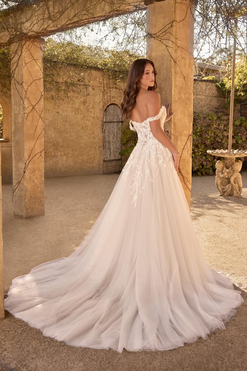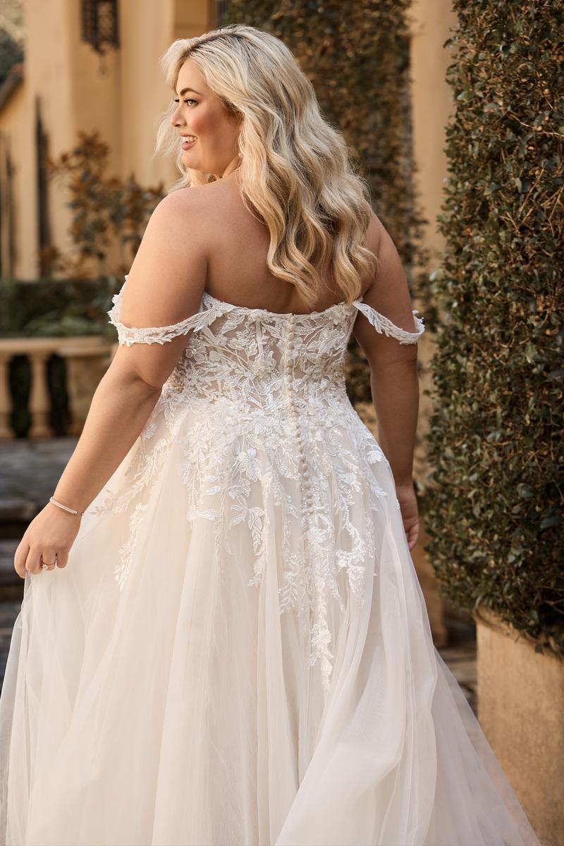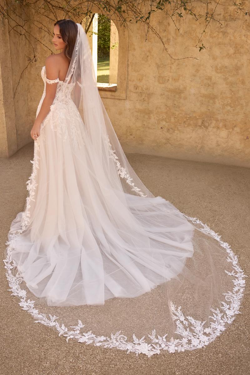 Fairytale and elegant Off-Shoulder Floral in beautiful lace Wedding Dress with a slit on the skirt.