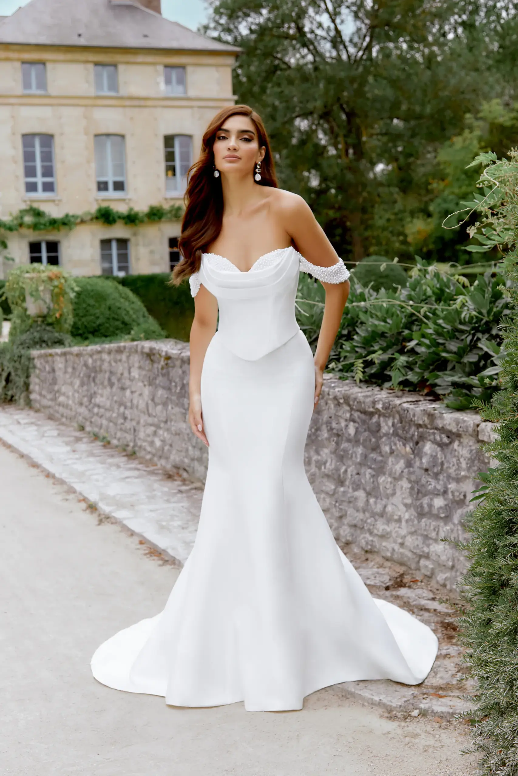 La dentelle d’inspiration florale est habilement disposée sur toute la robe pour mettre en valeur vos courbes et se fond élégamment dans la jupe évasée. La traîne semi-transparente présente des appliqués flottants et une fi nition romantique en bordure festonnée.